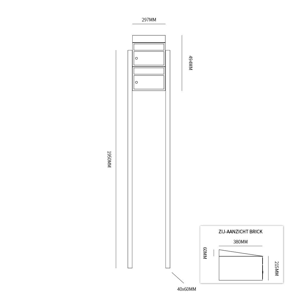 Per brievenbus is de Brick met zijn compacte maat van 295x215x380 (bxhxd) een perfect in te zetten brievenbus voor aan de wand, in de wand en op statief.
